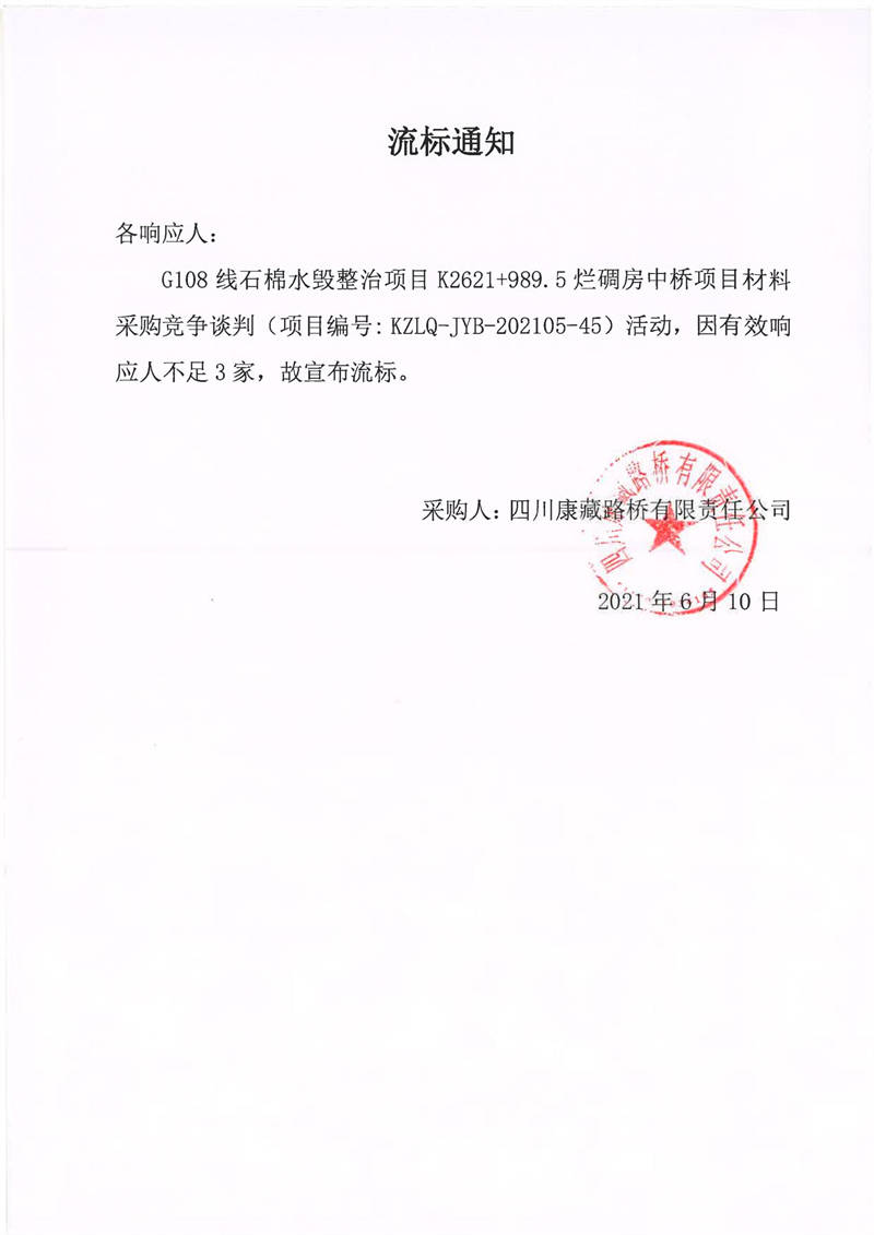 四川康藏路橋有限責(zé)任公司G108線石棉水毀整治項(xiàng)目K2621+989.5爛碉房中橋項(xiàng)目材料采購競(jìng)爭(zhēng)談判流標(biāo)通知