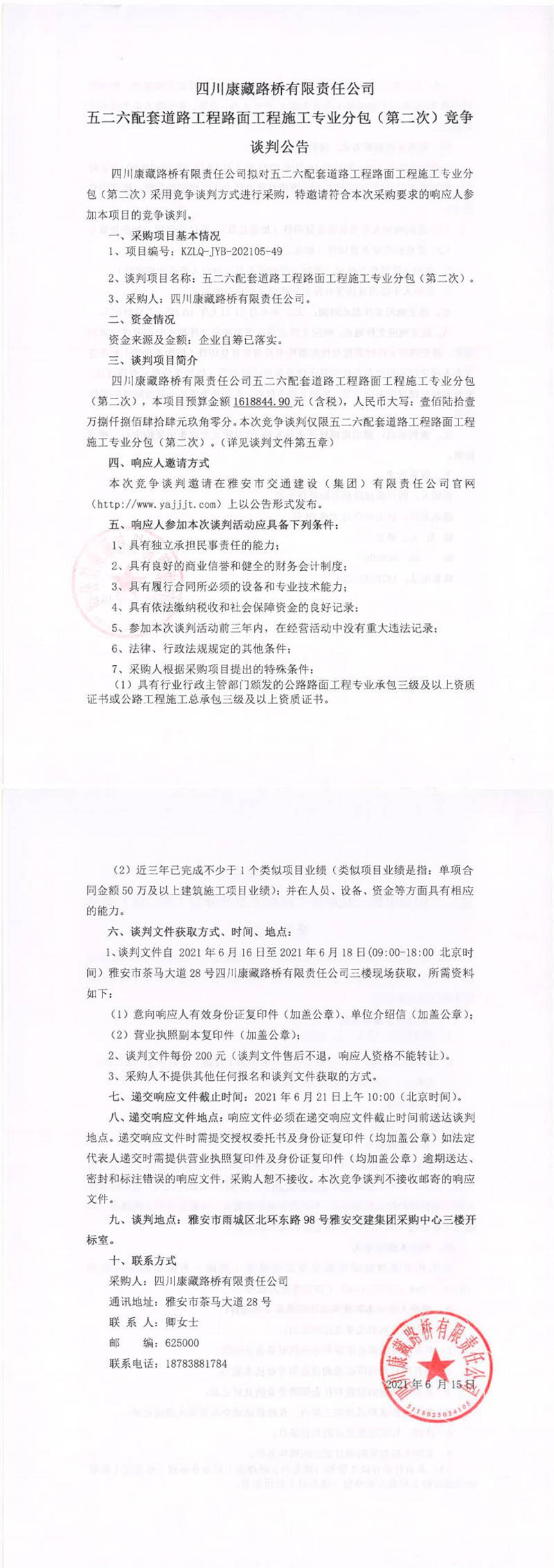 四川康藏路橋有限責任公司五二六配套道路工程路面工程施工專業(yè)分包(第二次)競爭談判公告