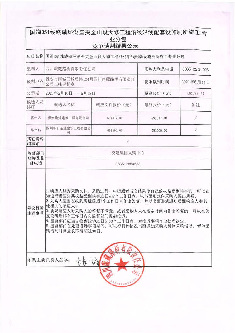 四川康藏路橋有限責任公司國道351線蹺磧環(huán)湖至夾金山段大修工程沿線沿線配套設施廁所施工專業(yè)分包競爭談判結(jié)果公示
