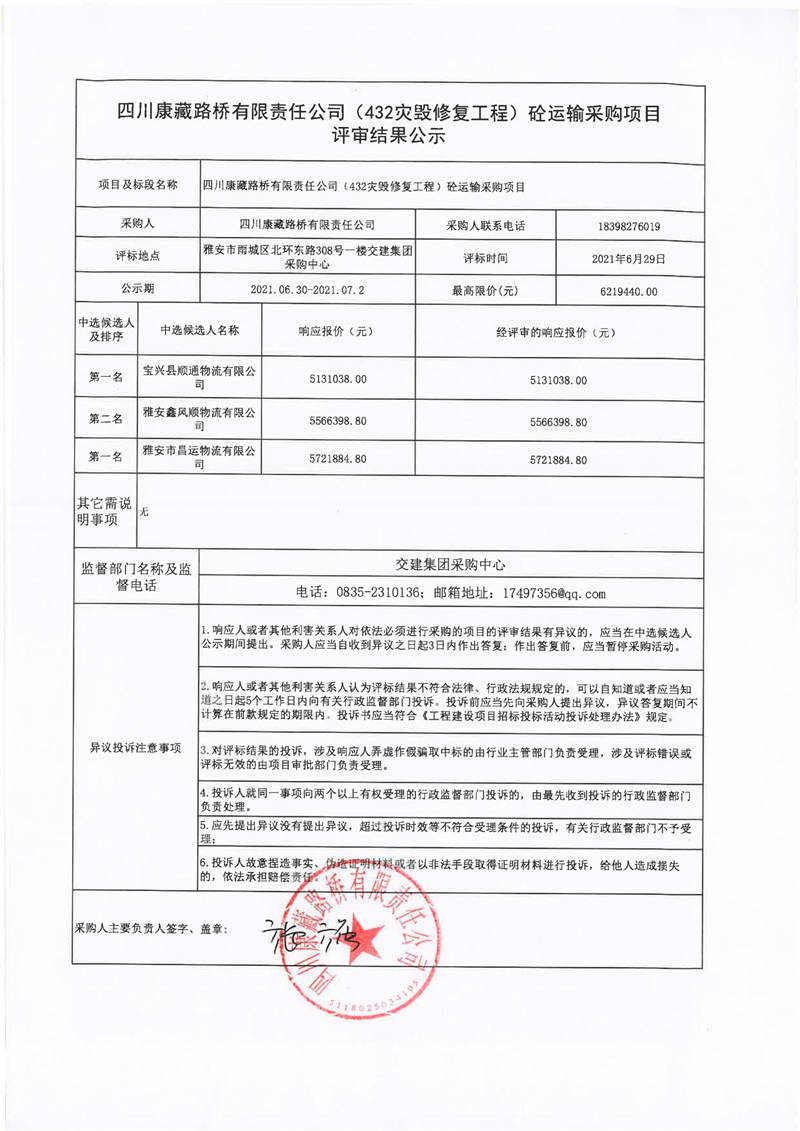四川康藏路橋有限責任公司S432線寶興縣兩河口至甘孜界段災(zāi)毀修復整治工程砼運輸采購項目評審結(jié)果公示