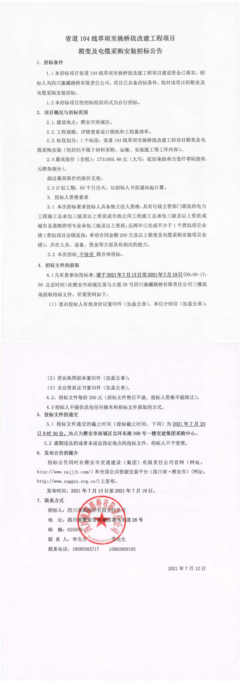 四川康藏路橋有限責(zé)任公司省道104線草壩至姚橋段改建項目箱變及電纜采購安裝招標公告