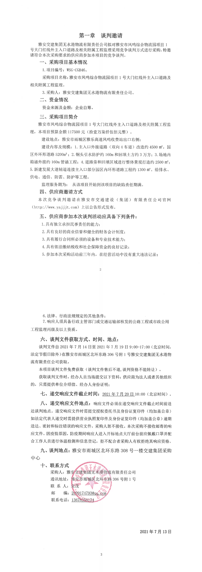 雅安交建集團(tuán)無(wú)水港物流有限責(zé)任公司雅安市鳳鳴綜合物流園項(xiàng)目1號(hào)大門紅線外主入口道路及相關(guān)附屬工程監(jiān)理競(jìng)爭(zhēng)談判公告