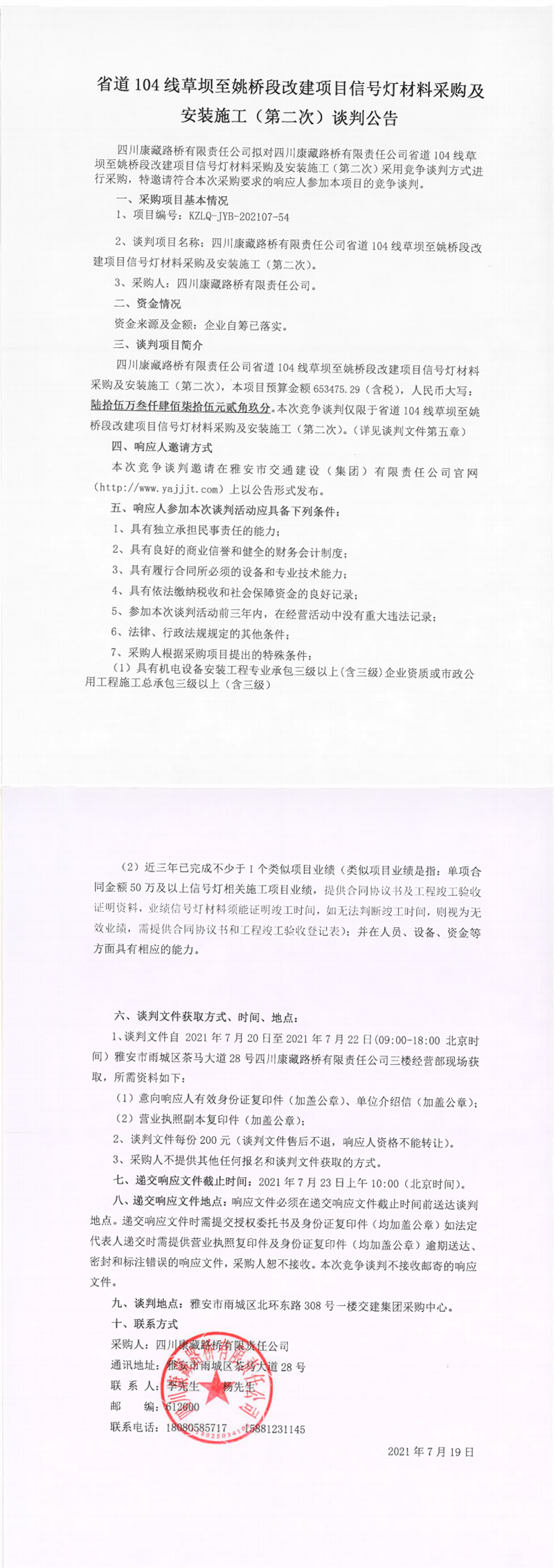 四川康藏路橋有限責任公司省道104線草壩至姚橋段改建項目信號燈材料采購及安裝施工(第二次)談判公告