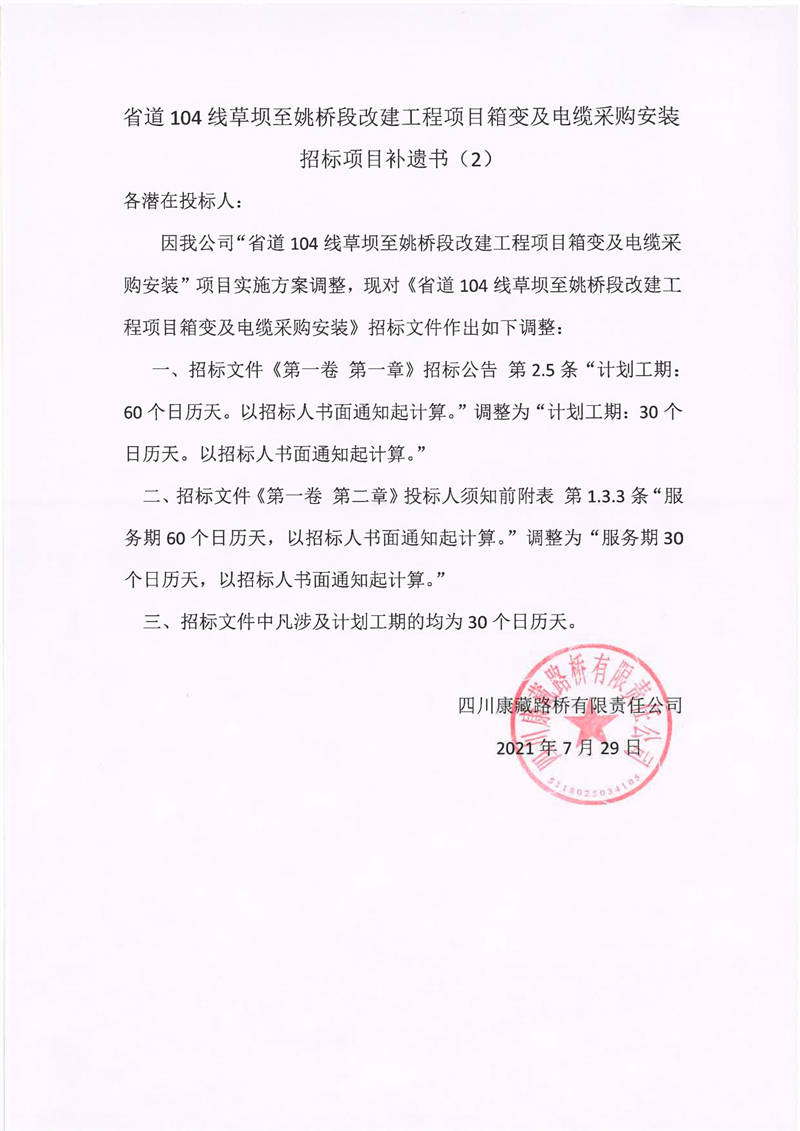 四川康藏路橋有限責(zé)任公司省道104線草壩至姚橋段改建項(xiàng)目箱變及電纜采購(gòu)安裝招標(biāo)項(xiàng)目補(bǔ)遺書(2)