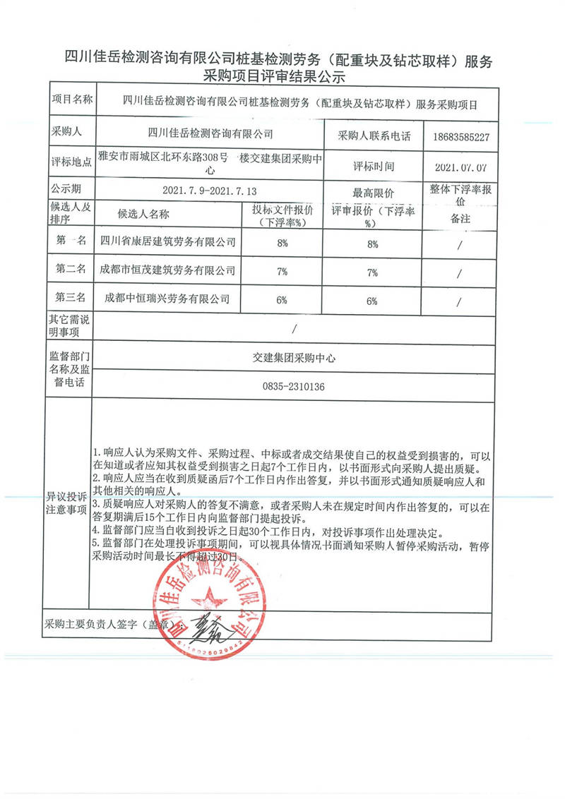 四川佳岳檢測咨詢有限公司樁基檢測勞務(wù)(配重塊及鉆芯取樣)服務(wù)采購項目評審結(jié)果公示