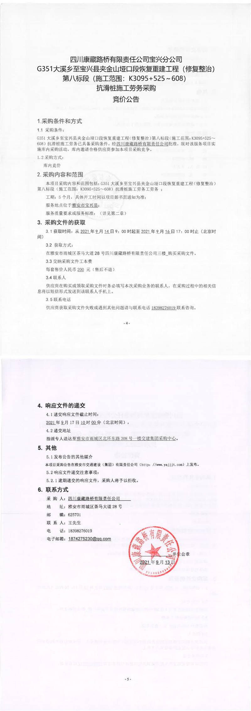 四川康藏路橋有限責(zé)任公司寶興分公司G351大溪鄉(xiāng)至寶興縣夾金山埡口段恢復(fù)重建工程(修復(fù)整治)第八標(biāo)段(施工范圍:K3095+525-608)抗滑樁施工勞務(wù)采購(gòu)競(jìng)價(jià)公告