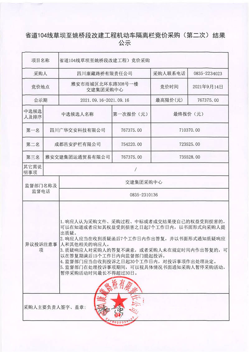 四川康藏路橋有限責(zé)任公司省道104線草壩至姚橋段改建工程機(jī)動(dòng)車(chē)隔離欄競(jìng)價(jià)采購(gòu)(第二次)結(jié)果公示