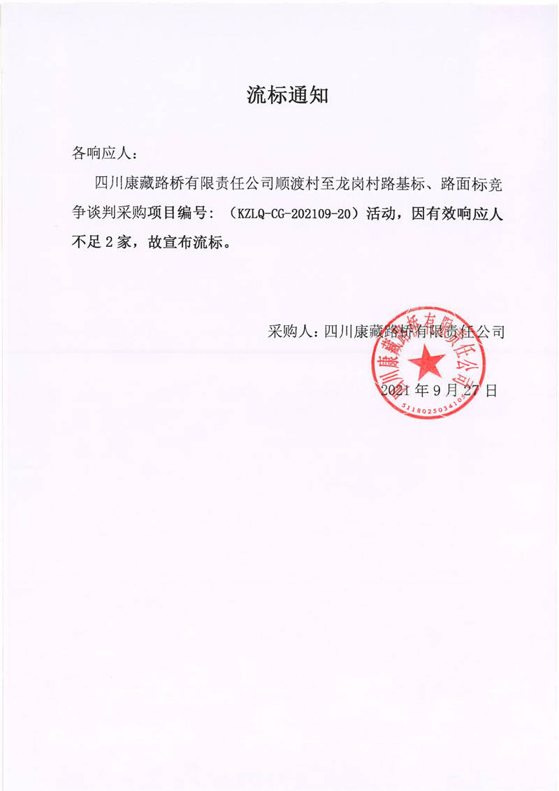 四川康藏路橋有限責(zé)任公司順渡村至龍崗村路基標(biāo)、路面標(biāo)競爭談判采購項(xiàng)目流標(biāo)通知