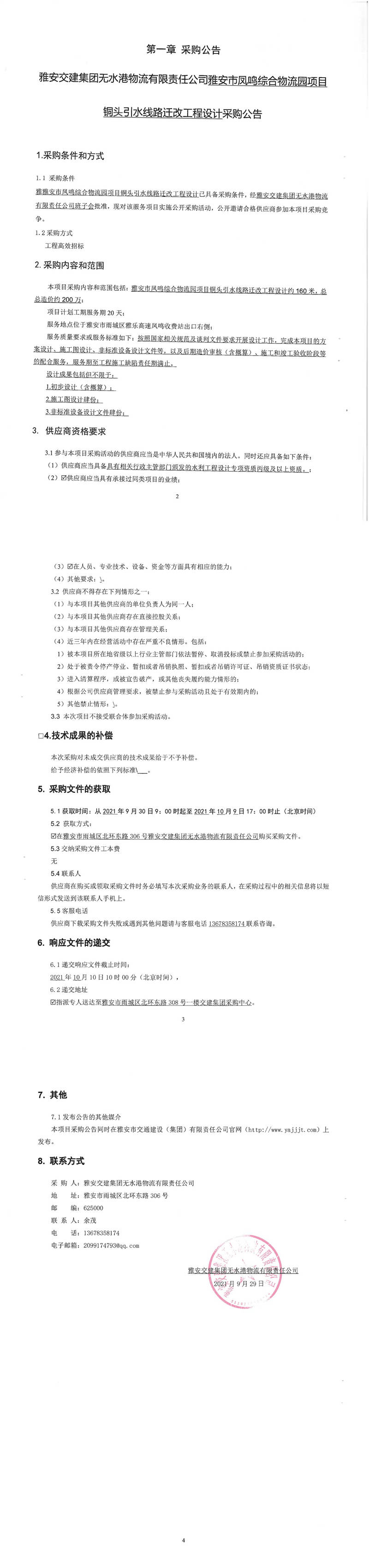 雅安交建集團(tuán)無(wú)水港物流有限責(zé)任公司雅安市鳳鳴綜合物流園項(xiàng)目銅頭引水線路遷改工程設(shè)計(jì)采購(gòu)公告