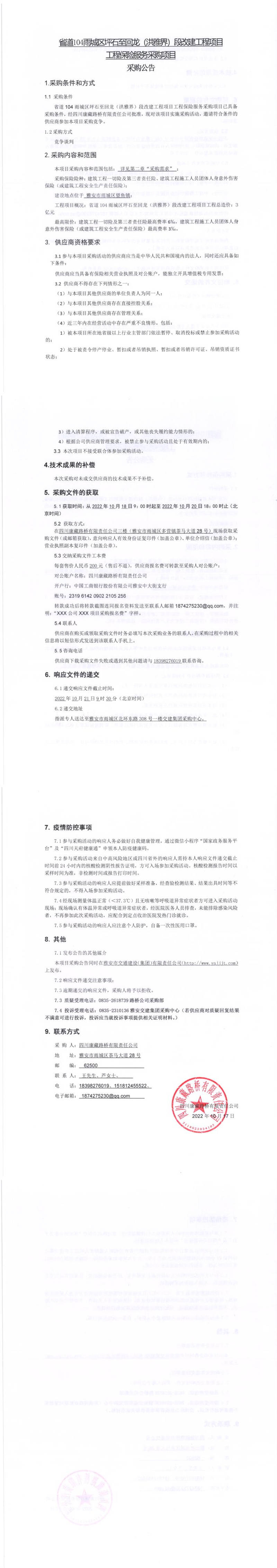 四川康藏路橋有限責(zé)任公司省道104雨城區(qū)坪石至回龍(洪雅界)段改建工程項(xiàng)目工程保險(xiǎn)服務(wù)采購項(xiàng)目采購公告