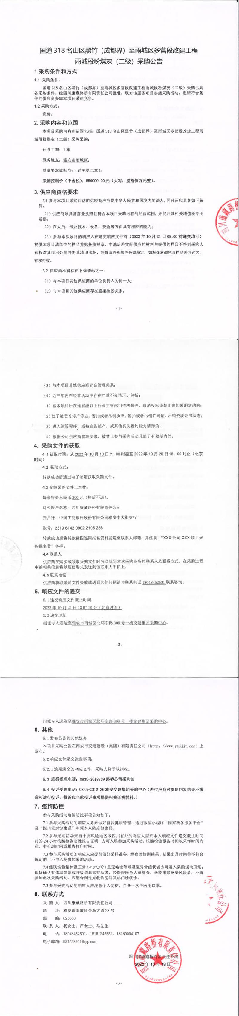 四川康藏路橋有限責(zé)任公司國道318名山區(qū)黑竹(成都界)至雨城區(qū)多營段改建工程雨城段粉煤灰(二級)采購公告