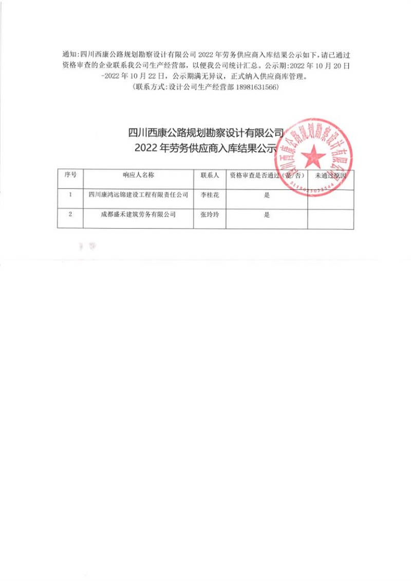 四川西康公路規(guī)劃勘察設(shè)計有限公司2022年勞務(wù)供應(yīng)商入庫結(jié)果公示