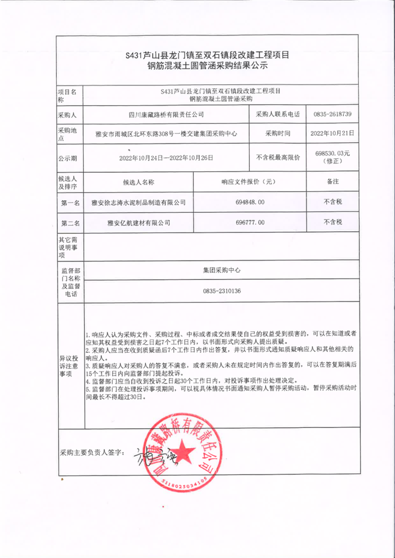 四川康藏路橋有限責(zé)任公司S431蘆山縣龍門鎮(zhèn)至雙石鎮(zhèn)段改建工程項目鋼筋混凝土圓管涵采購結(jié)果公示