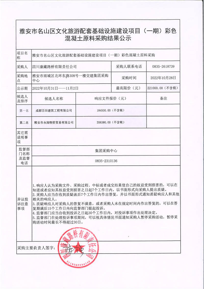 四川康藏路橋有限責(zé)任公司雅安市名山區(qū)文化旅游配套基礎(chǔ)設(shè)施建設(shè)項(xiàng)目(一期)彩色混凝土原料采購結(jié)果公示