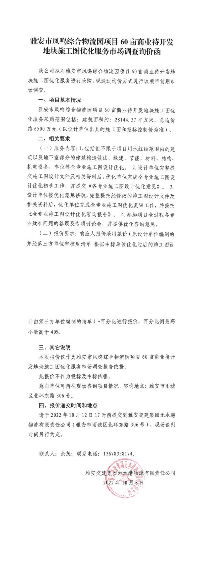 雅安交建集團(tuán)無水港物流有限責(zé)任公司雅安市鳳鳴綜合物流園項目60畝商業(yè)待開發(fā)地塊施工圖優(yōu)化服務(wù)市場調(diào)查詢價函