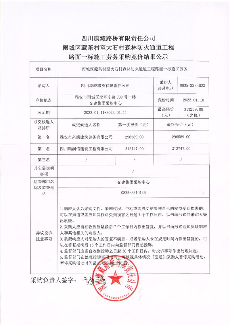 四川康藏路橋有限責(zé)任公司雨城區(qū)藏茶村至大石村森林防火通道工程路面一標(biāo)施工勞務(wù)采購競價(jià)結(jié)果公示
