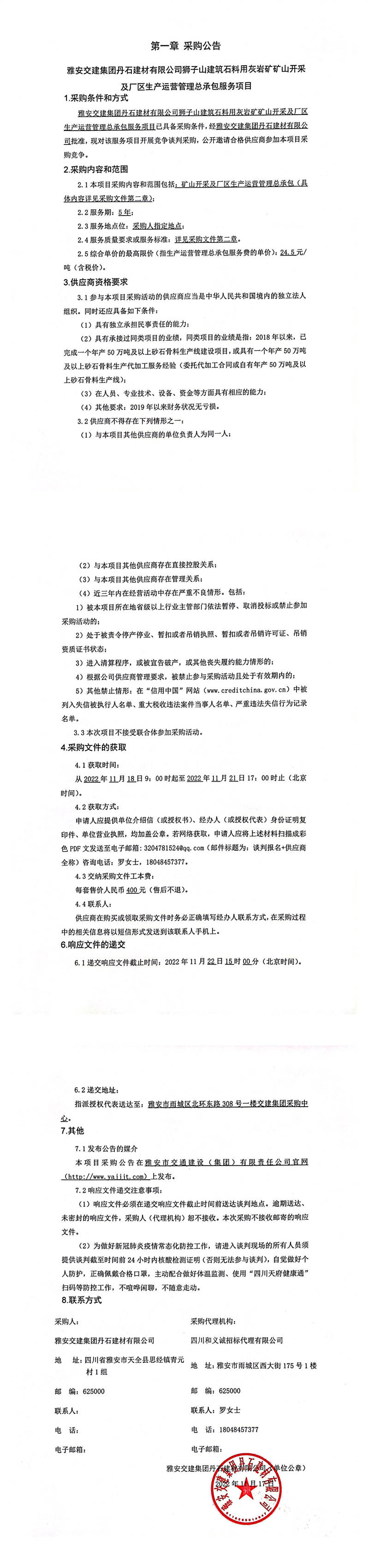 雅安交建集團丹石建材有限公司獅子山建筑石料用灰?guī)r礦礦山開采及廠區(qū)生產(chǎn)運營管理總承包服務項目采購公告