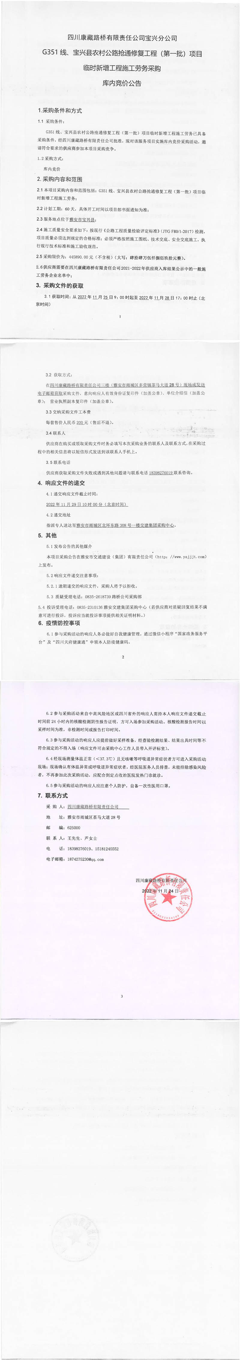 四川康藏路橋有限責(zé)任公司G351線、寶興縣農(nóng)村公路搶通修復(fù)工程(第一批)項(xiàng)目臨時(shí)新增工程施工勞務(wù)采購庫內(nèi)競價(jià)公告