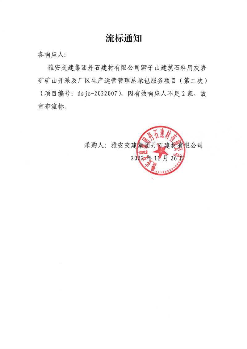 雅安交建集團(tuán)丹石建材有限公司獅子山建筑石料用灰?guī)r礦礦山開采及廠區(qū)生產(chǎn)運(yùn)營(yíng)管理總承包服務(wù)項(xiàng)目(第二次)流標(biāo)通知