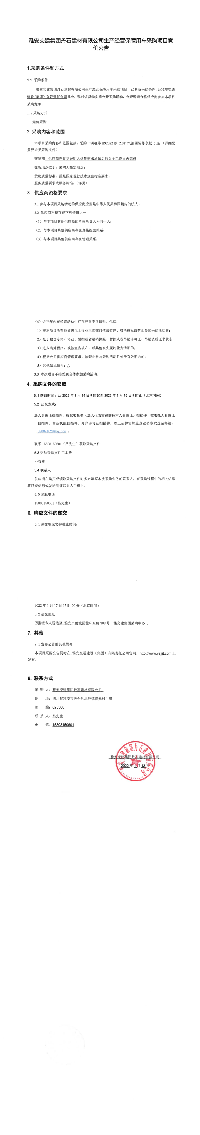 雅安交建集團(tuán)丹石建材有限公司生產(chǎn)經(jīng)營(yíng)保障用車(chē)采購(gòu)項(xiàng)目競(jìng)價(jià)公告