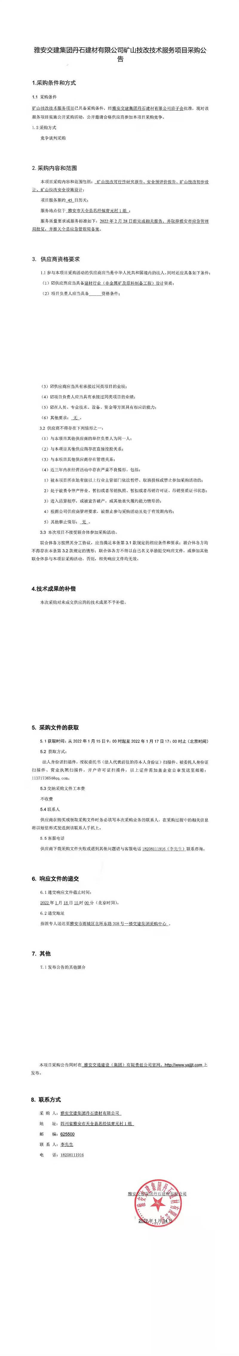 雅安交建集團(tuán)丹石建材有限公司礦山技改技術(shù)服務(wù)項(xiàng)目采購公告