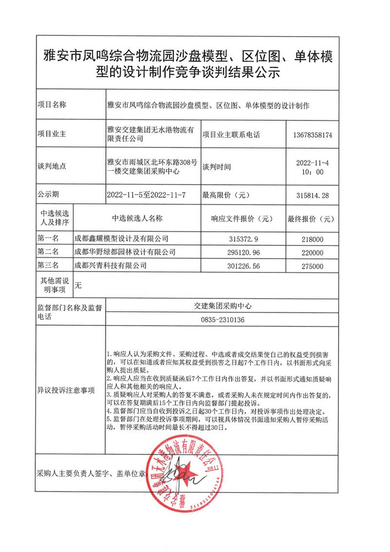 雅安交建集團(tuán)無水港物流有限責(zé)任公司雅安市鳳鳴綜合物流園沙盤模型、區(qū)位圖、單體模型的設(shè)計(jì)制作競爭談判結(jié)果公示
