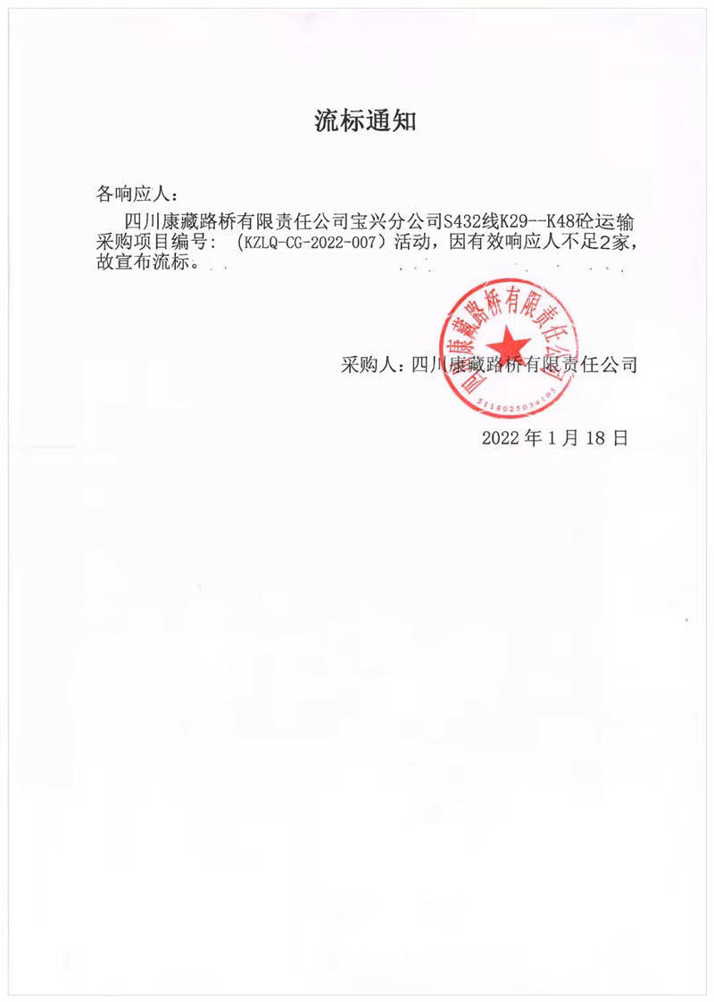 四川康藏路橋有限責(zé)任公司寶興分公司S432線K29-K48砼運輸采購項目流標(biāo)通知
