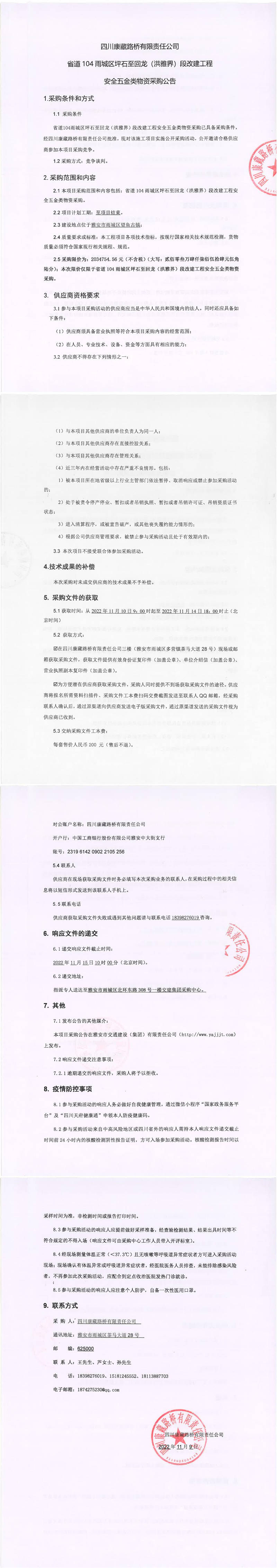 四川康藏路橋有限責(zé)任公司省道104雨城區(qū)坪石至回龍(洪雅界)段改建工程安全五金類(lèi)物資采購(gòu)公告