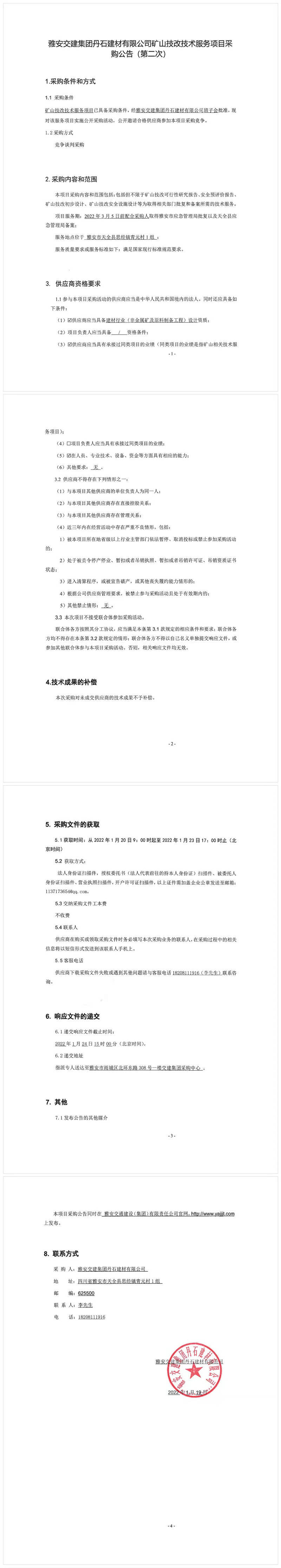 雅安交建集團(tuán)丹石建材有限公司礦山技改技術(shù)服務(wù)項(xiàng)目采購(gòu)公告(第二次)