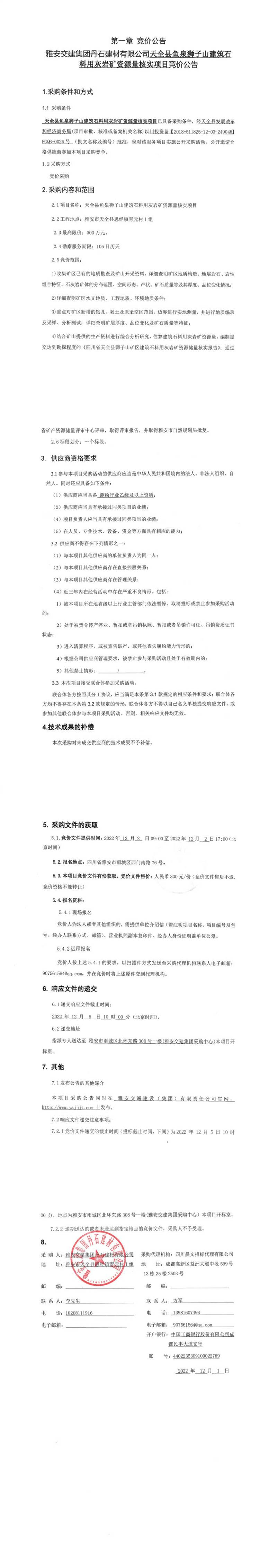 雅安交建集團(tuán)丹石建材有限公司天全縣魚泉獅子山建筑石料用灰?guī)r礦資源量核實項目競價公告
