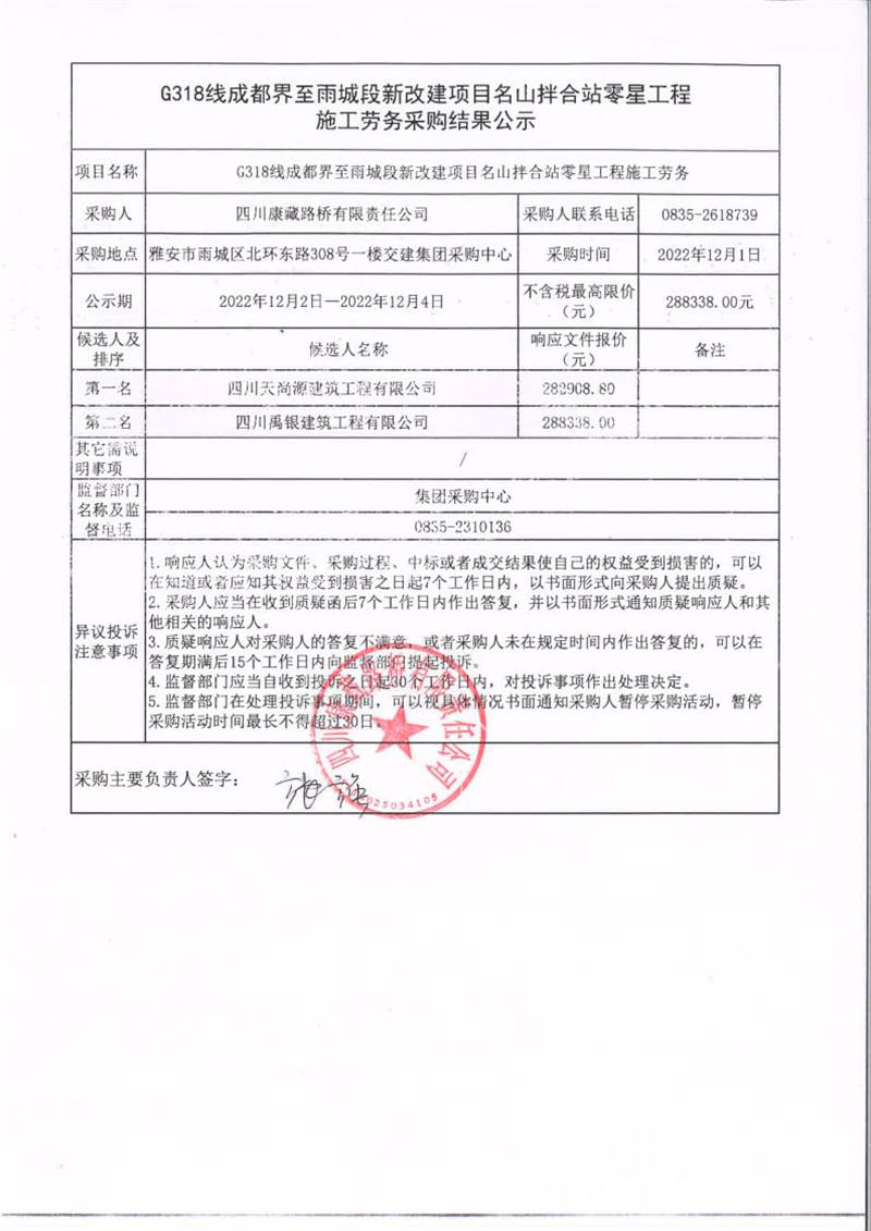 四川康藏路橋有限責任公司G318線成都界至雨城段新改建項目名山拌合站零星工程施工勞務采購結果公示