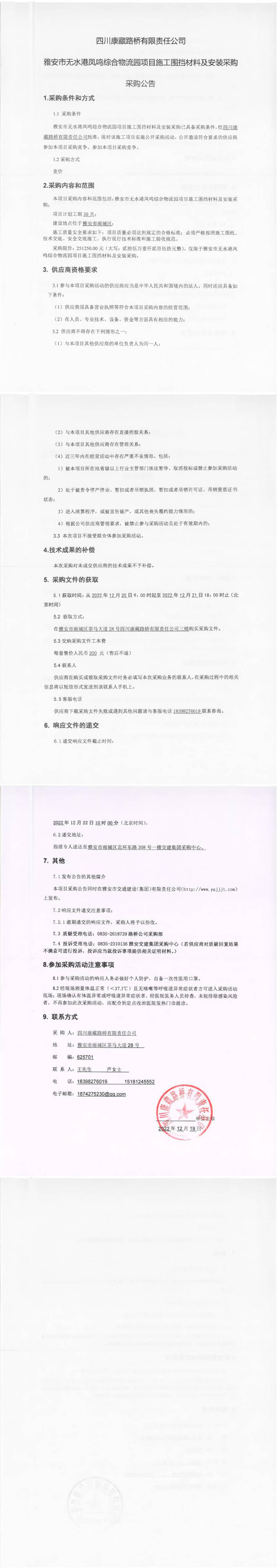 四川康藏路橋有限責(zé)任公司雅安市無水港鳳鳴綜合物流園項(xiàng)目施工圍擋材料及安裝采購采購公告