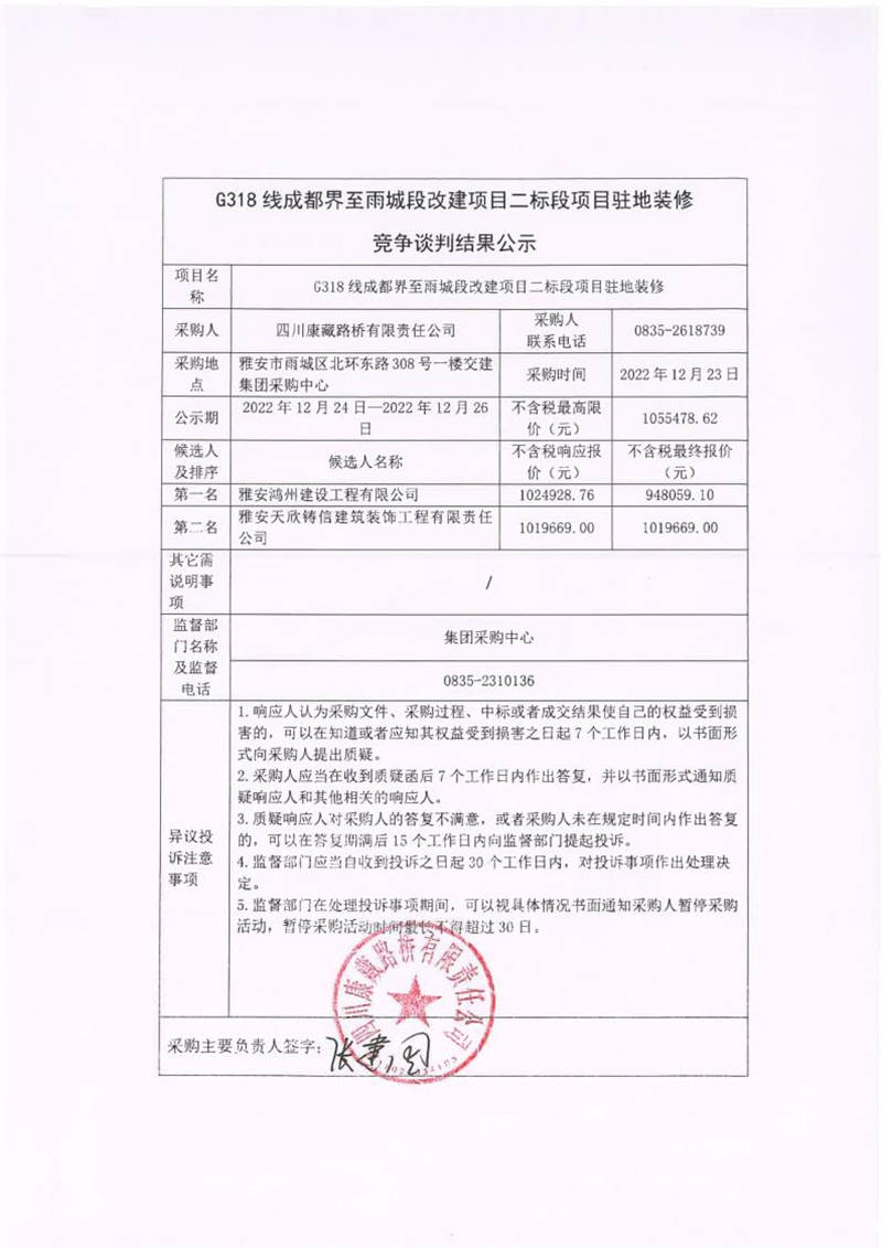 四川康藏路橋有限責(zé)任公司G318線(xiàn)成都界至雨城段改建項(xiàng)目二標(biāo)段項(xiàng)目駐地裝修競(jìng)爭(zhēng)談判結(jié)果公示