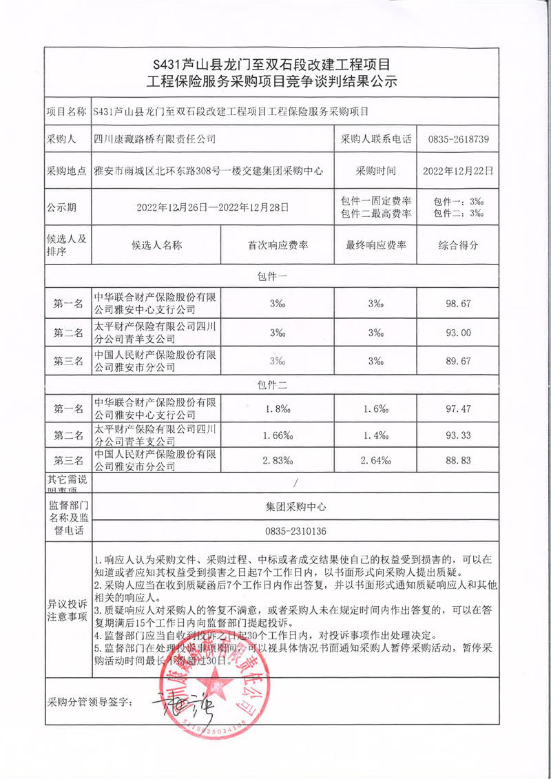 四川康藏路橋有限責(zé)任公司S431蘆山縣龍門至雙石段改建工程項目工程保險服務(wù)采購項目競爭談判結(jié)果公示