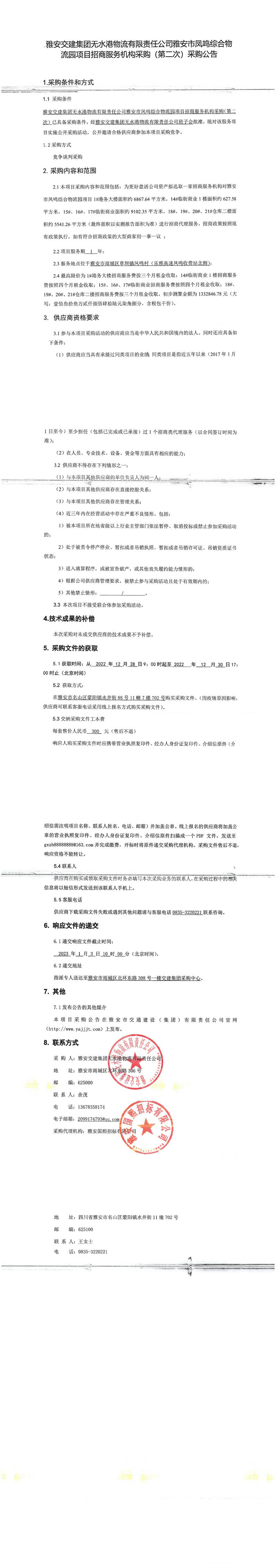 雅安交建集團無水港物流有限責(zé)任公司雅安市鳳鳴綜合物流園項目招商服務(wù)機構(gòu)采購(第二次)采購公告