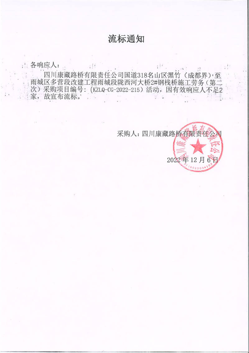四川康藏路橋有限責任公司國道318名山區(qū)黑竹(成都界)至雨城區(qū)多營段改建工程雨城段隴西河大橋2#鋼棧橋施工勞務(第二次)采購項目流標通知