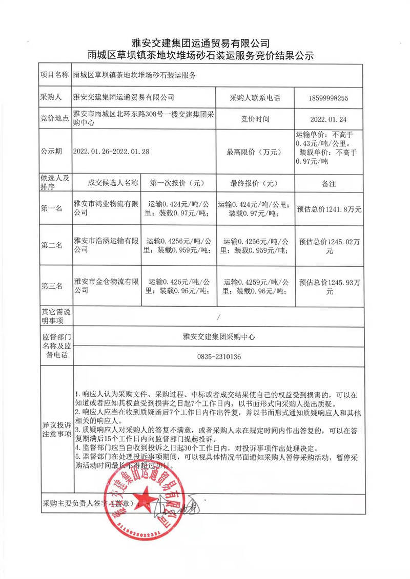 雅安交建集團(tuán)運(yùn)通貿(mào)易有限公司雨城區(qū)草壩鎮(zhèn)茶地坎堆場砂石裝運(yùn)服務(wù)競價結(jié)果公示