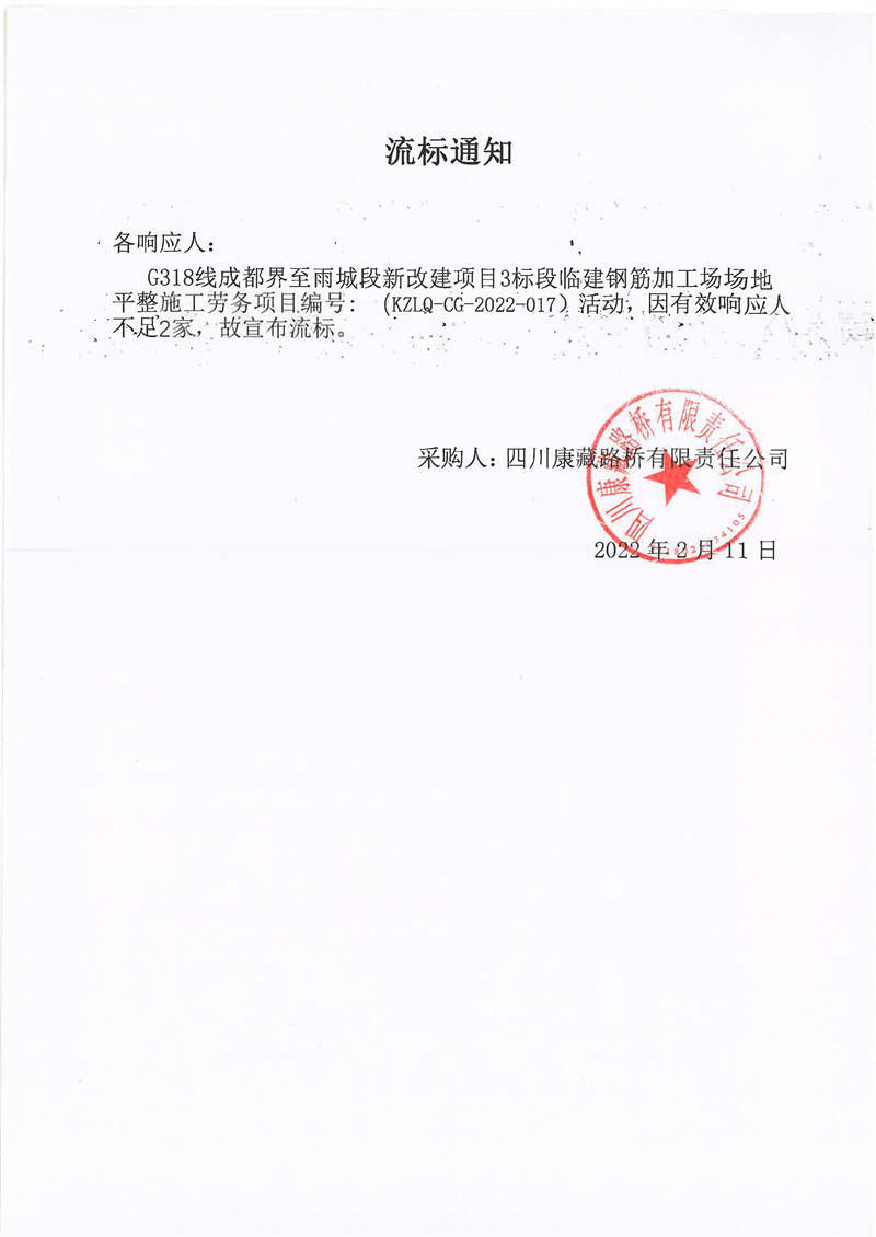 四川康藏路橋有限責(zé)任公司G318線成都界至雨城段新改建項(xiàng)目3標(biāo)段臨建鋼筋加工場場地平整施工勞務(wù)項(xiàng)目流標(biāo)通知