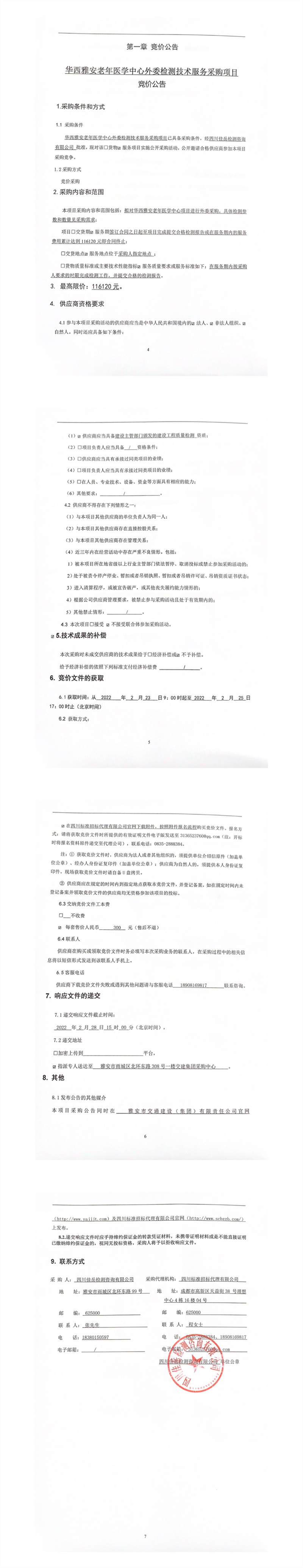 四川佳岳檢測咨詢有限公司華西雅安老年醫(yī)學中心外委檢測技術服務采購項目競價公告