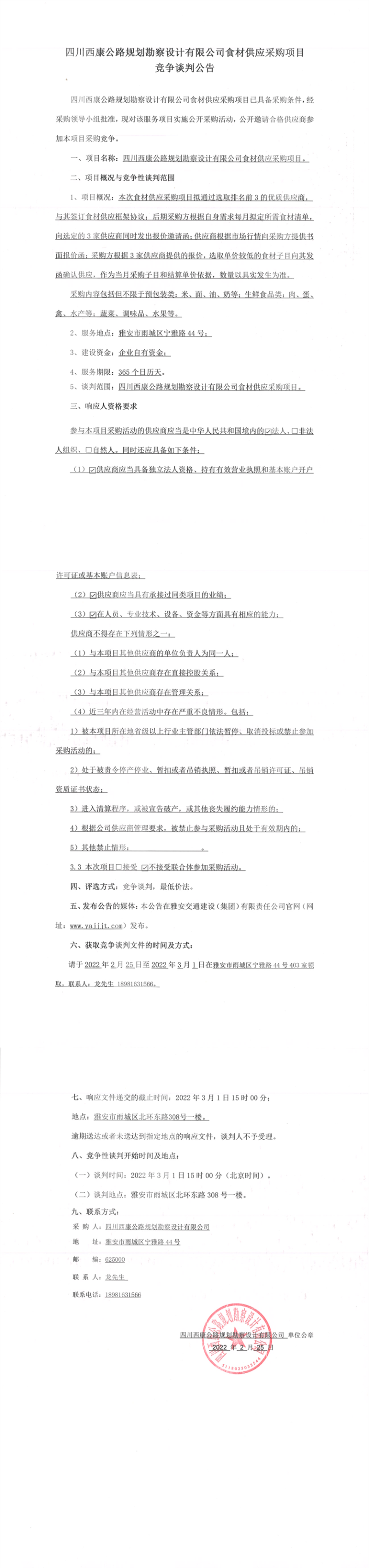 四川西康公路規(guī)劃勘察設(shè)計(jì)有限公司食材供應(yīng)采購(gòu)項(xiàng)目競(jìng)爭(zhēng)談判公告