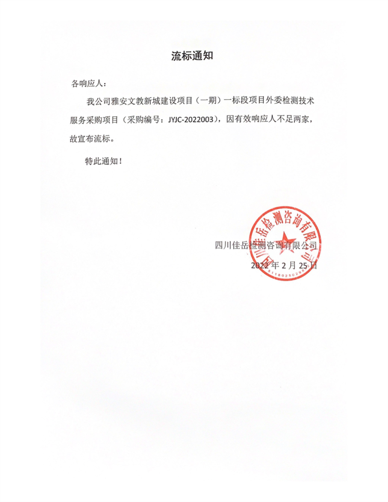 四川佳岳檢測咨詢有限公司雅安文教新城建設(shè)項(xiàng)目(一期)一標(biāo)段項(xiàng)目外委檢測技術(shù)服務(wù)采購項(xiàng)目流標(biāo)通知