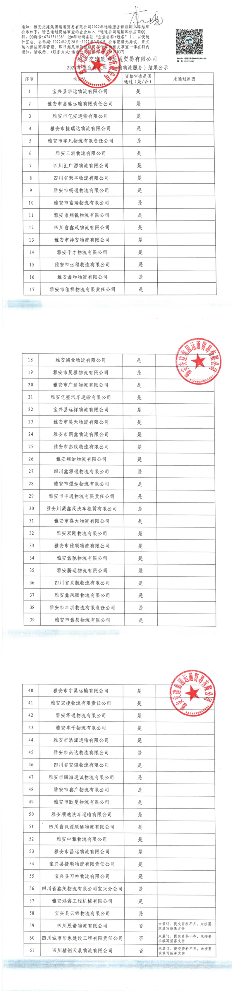 雅安交建集團運通貿(mào)易有限公司2022年供應商入庫(運輸物流服務)結果公示