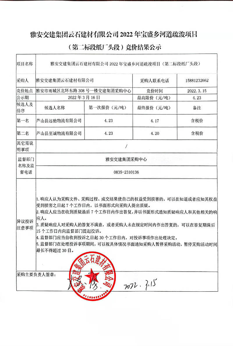 雅安交建集團(tuán)云石建材有限公司2022年寶盛鄉(xiāng)河道疏浚項(xiàng)目(第二標(biāo)段紙廠頭段)競價(jià)結(jié)果公示