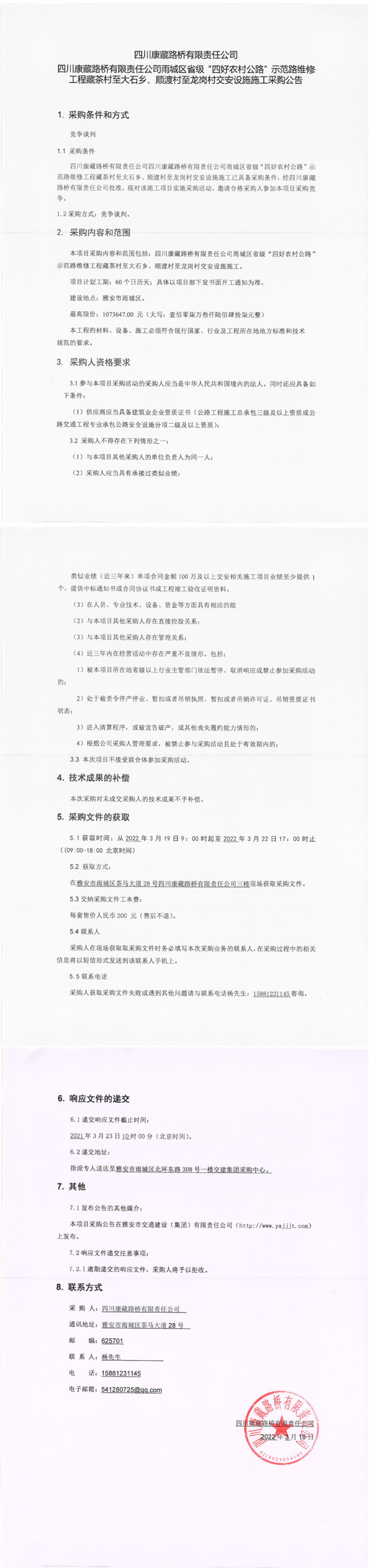 四川康藏路橋有限責(zé)任公司雨城區(qū)省級(jí)“四好農(nóng)村公路”示范路維修工程藏茶村至大石鄉(xiāng)、順渡村至龍崗村交安設(shè)施施工采購公告