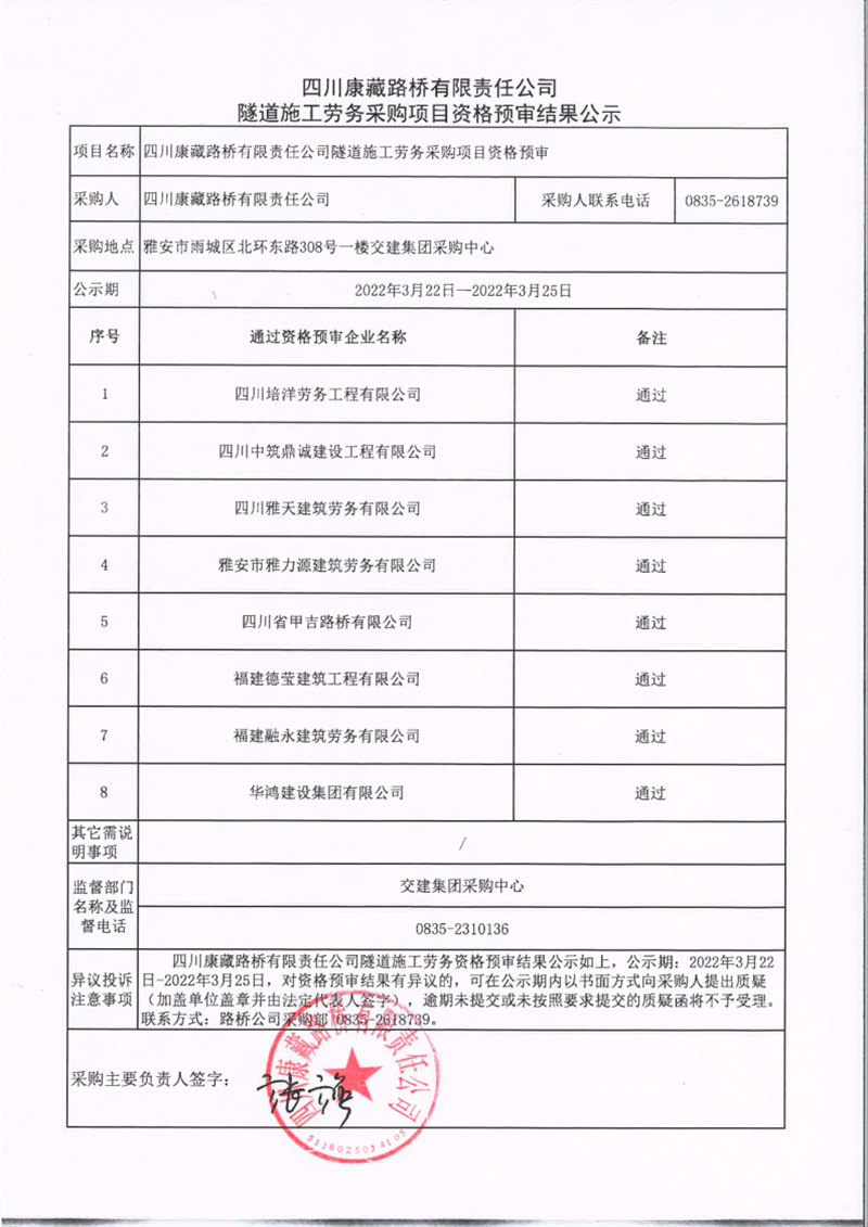 四川康藏路橋有限責任公司隧道施工勞務采購項目資格預審結果公示