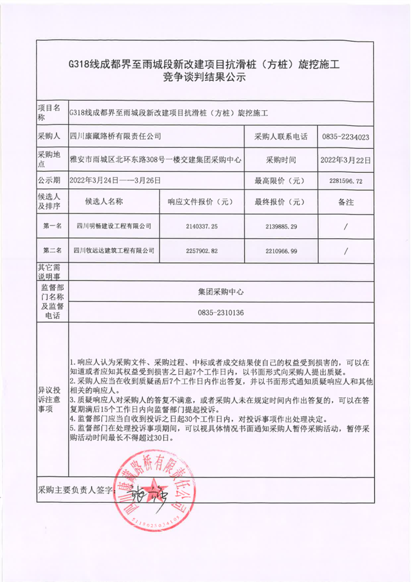 四川康藏路橋有限責任公司G318線成都界至雨城段新改建項目抗滑樁(方樁)旋挖施工競爭談判結(jié)果公示