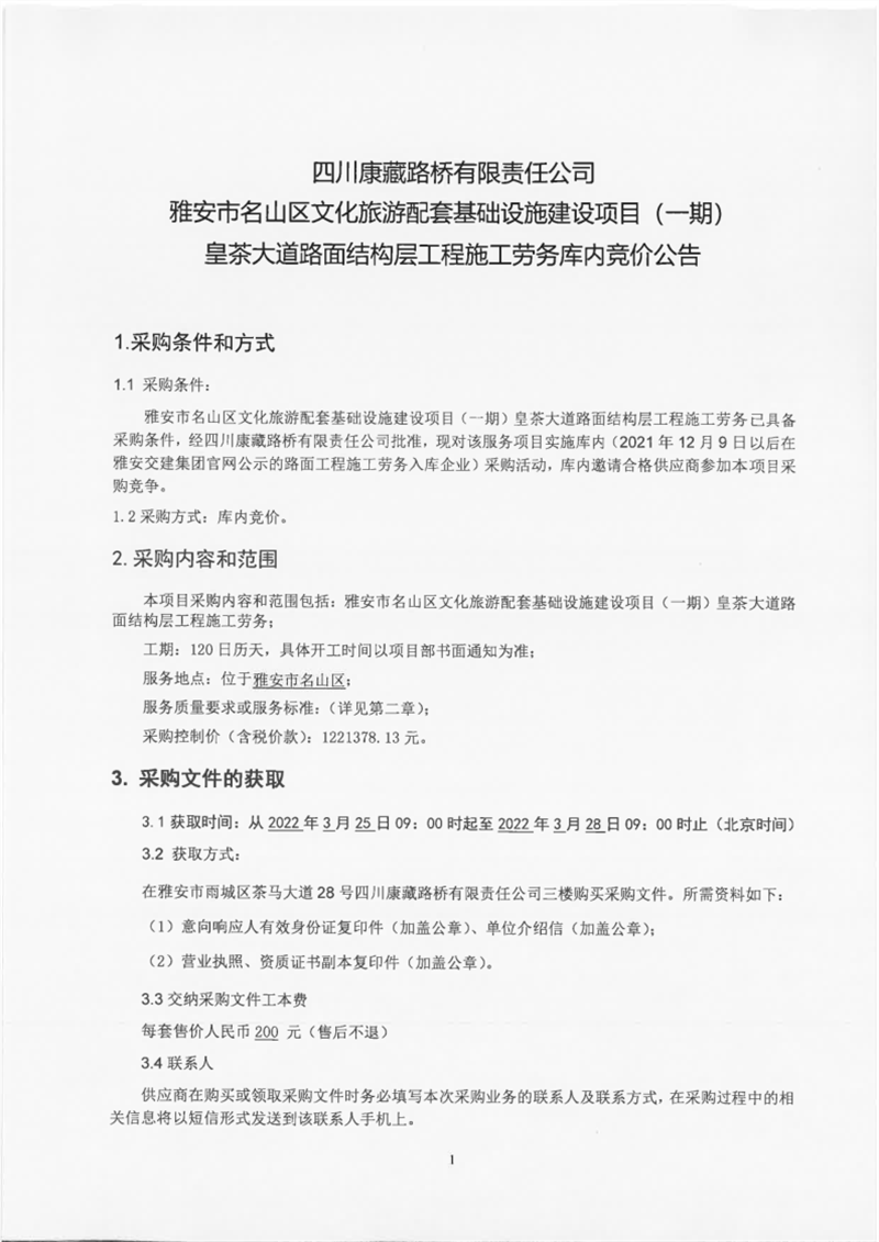 四川康藏路橋有限責任公司雅安市名山區(qū)文化旅游配套基礎設施建設項目(一期)皇茶大道路面結構層工程施工勞務庫內競價公告