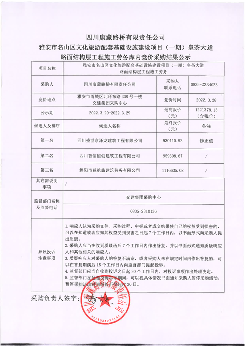 四川康藏路橋有限責(zé)任公司雅安市名山區(qū)文化旅游配套基礎(chǔ)設(shè)施建設(shè)項(xiàng)目(一期)路面結(jié)構(gòu)層工程施工勞務(wù)庫內(nèi)競(jìng)價(jià)采購結(jié)果公示