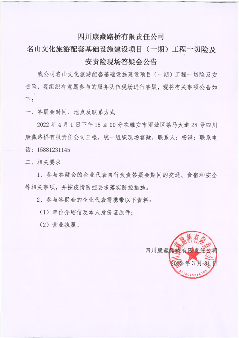 四川康藏路橋有限責任公司名山文化旅游配套基礎(chǔ)設(shè)施建設(shè)項目(一期)工程一切險及安責險現(xiàn)場答疑會公告