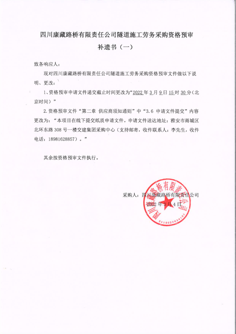 四川康藏路橋有限責(zé)任公司隧道施工勞務(wù)采購(gòu)資格預(yù)審補(bǔ)遺書(shū)(一)